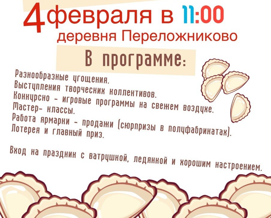 4 февраля в деревне Переложниково в 11 утра стартует фестиваль пельменей. Гости смогут попробовать пельмени по авторским рецептам, посетить чайную комнату и ярмарку, а также послушать концерт с участием артистов из других районов.
