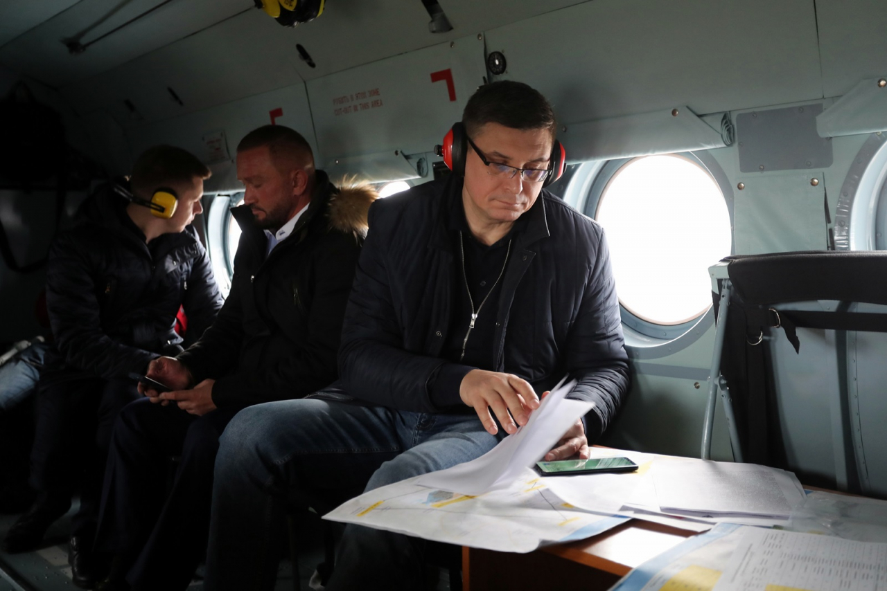 Пятиминутная готовность. На борт садятся глава региона, его заместитель и областные спасатели. Оперативную обстановку Александру Авдееву докладывают прямо на борту. Масштаб подтопления глава региона оценил не только по картам. Но и из иллюминатора вертолета. В небе Александр Авдеев провел двадцать минут. В поселке Труд его встречают местные жители и сразу ведут к свои домам.