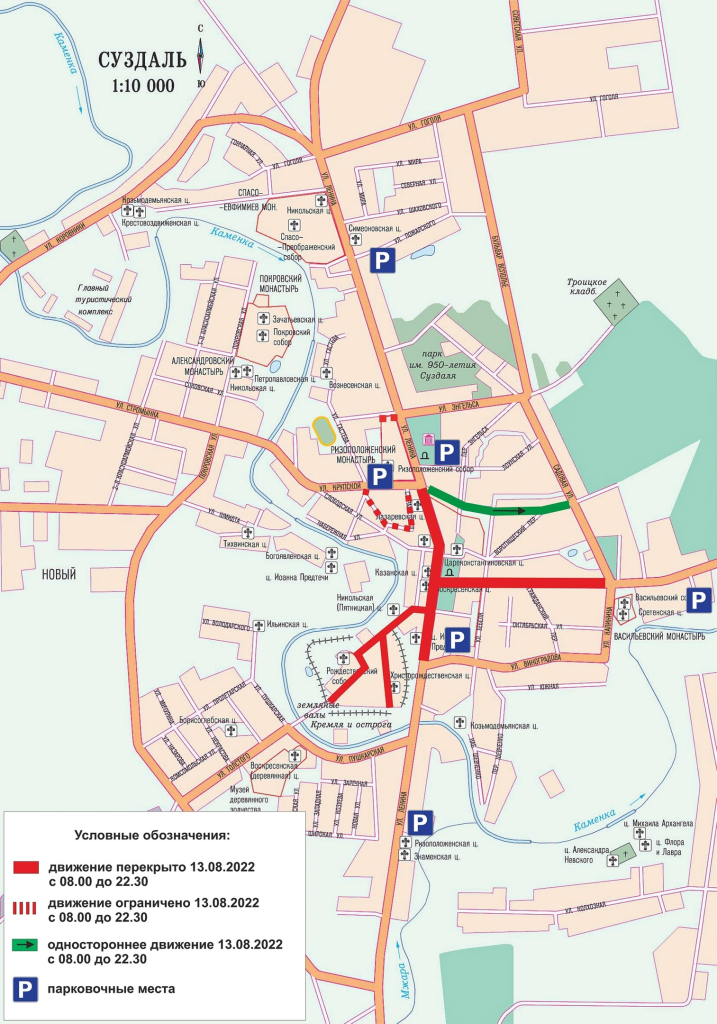 В этом же временно интервале будет запрещено движение по ул. Кремлевская, кроме автотранспорта Владимиро-Суздальского музея-заповедника, спецтранспорта МЧС, скорой, свадебных кортежей, автомобилей со специальными пропусками и жителей города, проживающих на улицах Варганова, Кремлевская, Лебедева и Ленина, д. № 53, 63, 64, 66, 68, 70, 74. При этом движение автотранспорта по улице Нетека будет считаться односторонним из центра города в сторону улицы Садовой.